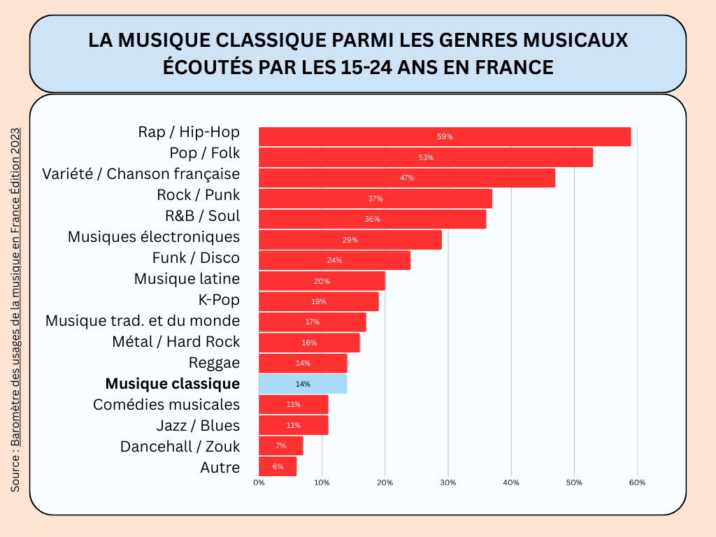 Malgré l’engouement de ces passionné·es, la musique classique est loin d’être en vogue chez les jeunes. D’après l’étude Comment les moins de 25 ans écoutent de la musique ? publiée en 2023 par le Centre national de la musique, le classique ne se trouve qu’en 13ᵉ position – à égalité avec le reggae (14 %) et juste avant les comédies musicales (11 %). « Pourtant, on l’entend partout ! Dans les pubs, au cinéma… On connaît forcément les Quatre Saisons de Vivaldi ou la Symphonie du Nouveau monde de Dvořák ! » explique Marie, étudiante en histoire et clarinettiste. Lucas, le hautboïste, insiste : « Avec plus d’éveil musical à l’école, on comprendrait mieux la richesse de la musique classique et on en écouterait sans doute davantage. »