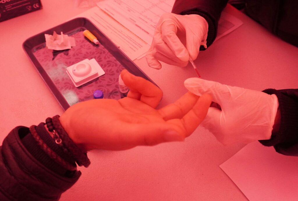 Dans une tente, Tito se fait dépister. L’examen est gratuit et rapide. Quelques gouttes de sang pour un résultat en moins de trente minutes. ©Elisa PÉREZ